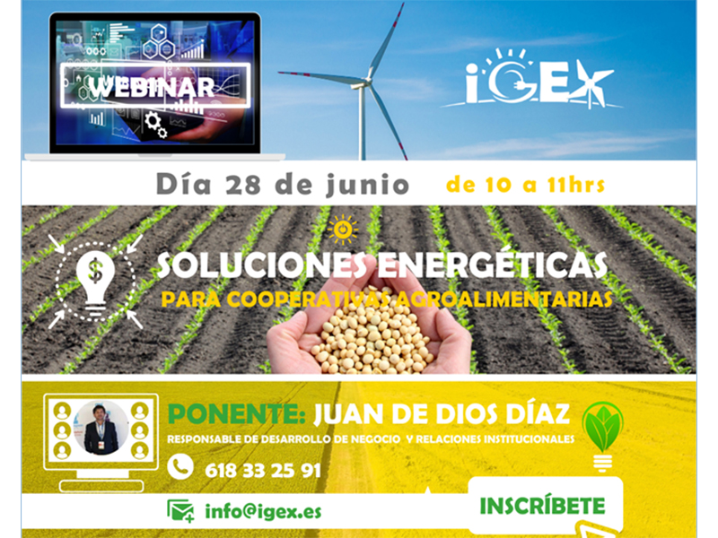 iGEX ha organizado para el próximo día 28 de junio, de 10 a 11 horas de la mañana, un seminario web sobre "Soluciones energéticas para Cooperativas Agroalimentarias", que será impartido por Juan de Dios Díaz, responsable de Negocio y Relaciones ...