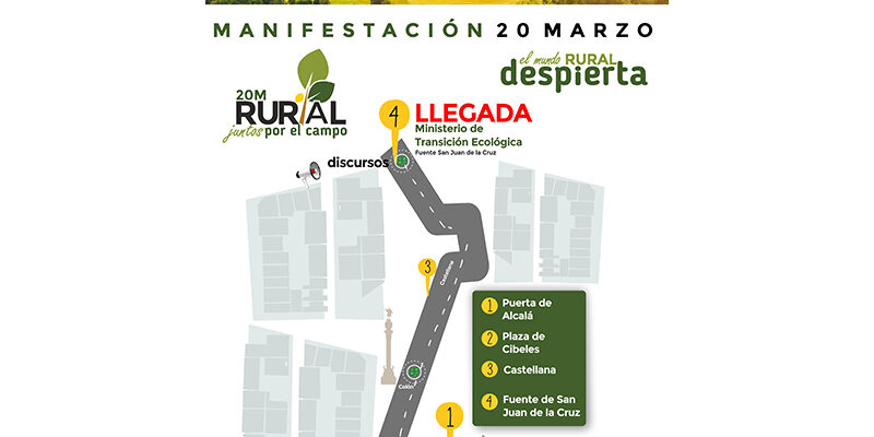 Bajo el lema #JuntosPorElCampo, las grandes organizaciones que representan al mundo rural saldrán a la calle para reivindicar las necesidades de quienes ocupan el 84% de territorio. La gran manifestación del campo español comenzará en la Puerta de Alcalá a las 11 de la mañana para continuar por el Paseo de la Castellana y finalizar en la fuente de San Juan de la Cruz, a la altura del MITECO