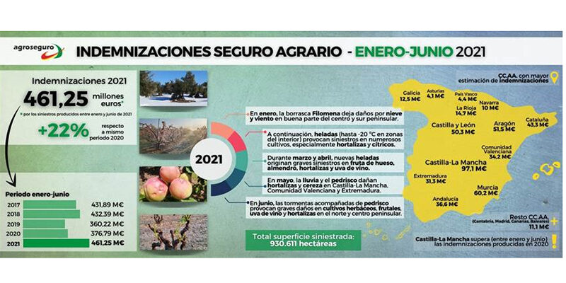 El comportamiento meteorológico del primer semestre de 2021, marcado por numerosos fenómenos de grave incidencia, ha provocado que las indemnizaciones previstas por los siniestros ocurridos entre enero y junio se eleven hasta los 461,25 millones de euros, lo que supone un 22% más que en el mismo periodo del año anterior. La superficie siniestrada total se sitúa en las 930.611 hectáreas, un 76% más que en 2020.